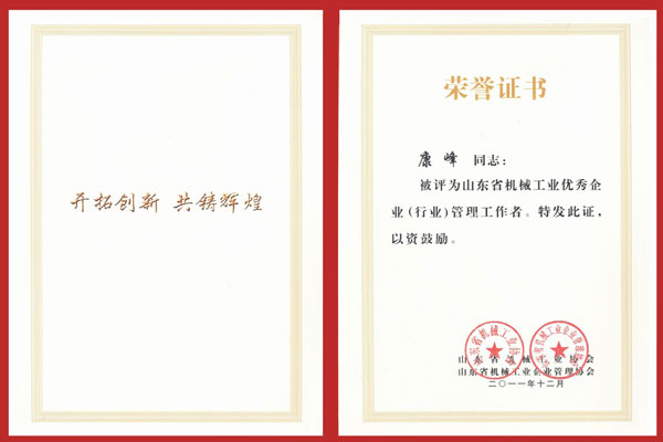 1月10日,山東省機械工業(yè)工作會議在泰安市東尊華美達酒店隆重召開,中國機械工業(yè)聯(lián)合會特別顧問朱森第、山東省機械工業(yè)協(xié)會會長劉衛(wèi)東、泰安市副市長閆新建等領(lǐng)導(dǎo)出席會議并頒獎。公司董事長、總經(jīng)理康鳳明,常務(wù)副總經(jīng)理潘憲平、副總經(jīng)理康峰等領(lǐng)導(dǎo)參加會議。董事長、總經(jīng)理康鳳明榮獲“山東省機械工業(yè)優(yōu)秀企業(yè)家”稱號,副總經(jīng)理朱洪臣榮獲“山東省機械工業(yè)有突出貢獻科技專家”稱號,副總經(jīng)理康峰榮獲“山東省機械工業(yè)優(yōu)秀企業(yè)(行業(yè))管理工作者”稱號。