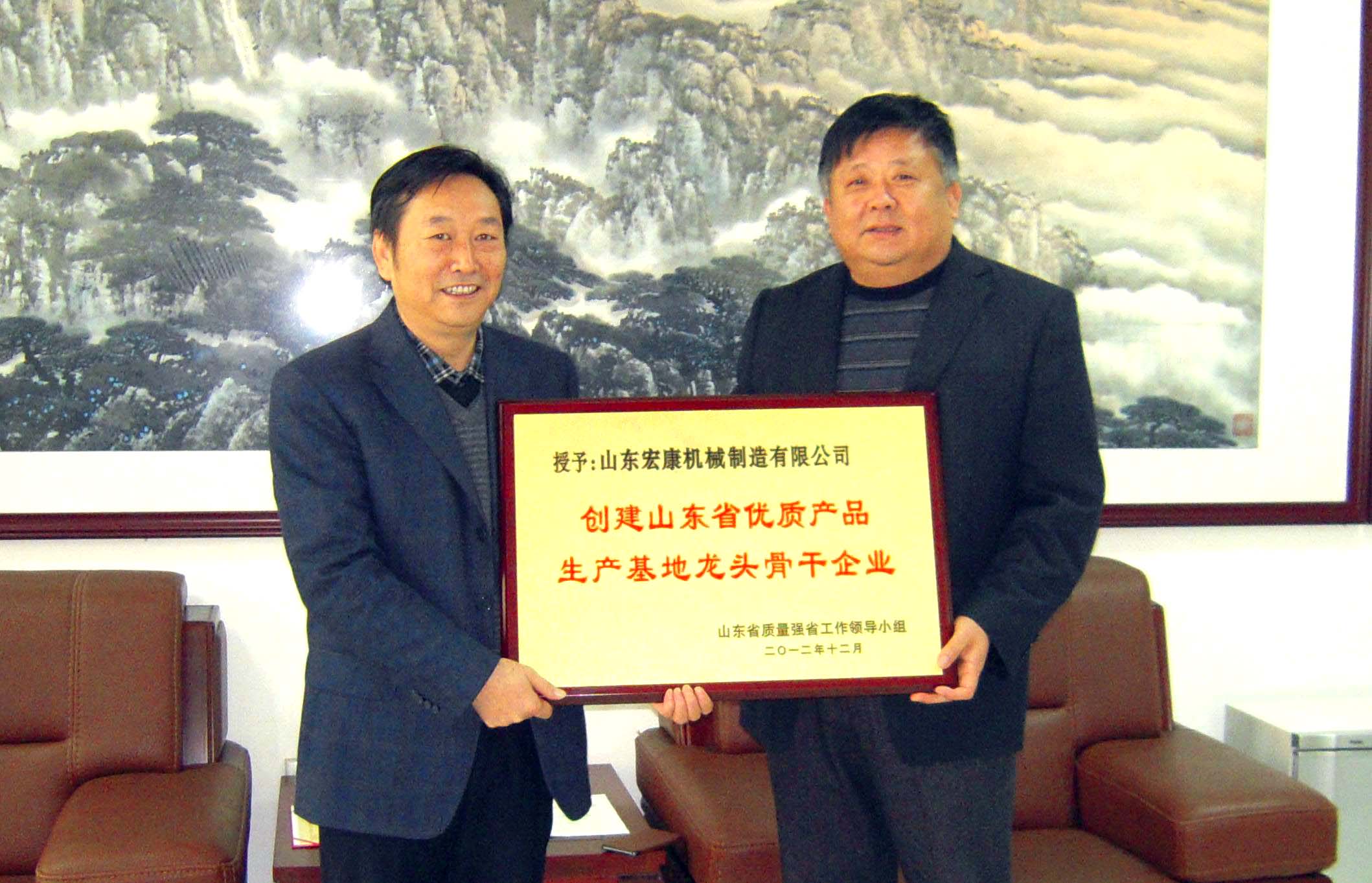 近日,山東省質量興省領導小組下發魯質強發【2012】2號文件《關于表彰2012年創建山東省優質產品生產基地及龍頭骨干企業的通知》,宏康榜上有名,喜獲2012年“創建山東省優質產品生產基地龍頭骨干企業”榮譽稱號。圖為1月30日岱岳區質監局局長張復田向集團董事長、總經理康鳳明頒發榮譽牌匾。